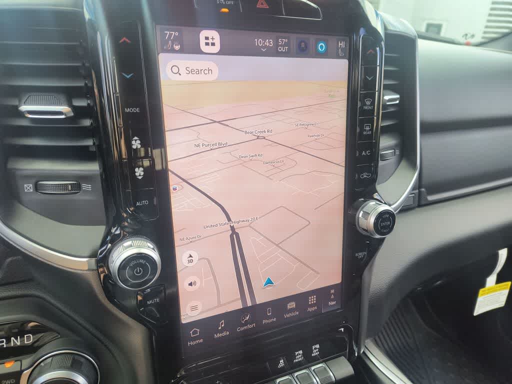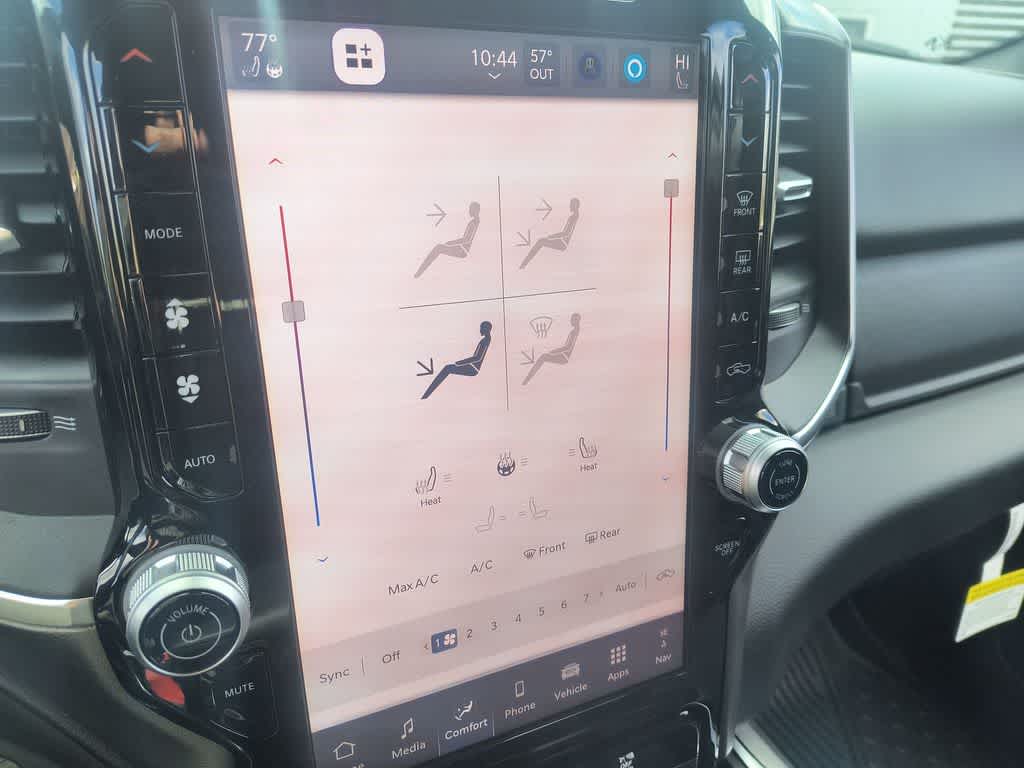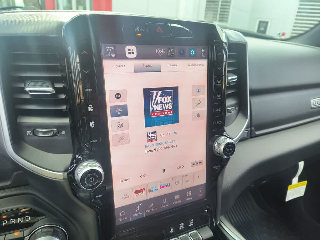 BIG HORN LEVEL 2 EQUIPMENT GROUP SiriusXM Radio Service, Power Adjustable Pedals, Leather Wrapped Steering Wheel, 12 Touchscreen Display, Glove Box Lamp, Auto Power-Folding Mirrors, 115V Auxiliary Rear Power Outlet, Media Hub w/2 Charge Only USBs, Heated Front Seats, Security Alarm, Black Premium Power Mirrors, Premium Overhead Console, 9 Amplified Speakers w/Subwoofer, Disassociated Touchscreen Display, Body Color Fender Flares, Remote Tailgate Release, 115V Auxiliary Power Outlet, LED Dome Lamp w/On/Off Switch, Universal Garage Door Opener, 2nd Row In Floor Storage Bins, Sun Visors w/Illuminated Vanity Mirrors, LED Footwell Lighting, Rear Window Defroster, Rear View Auto Dim Mirror, Rear Power Sliding Window, GPS Navigation, Overhead LED Lamps, Wheels: 20 x 9 Aluminum Chrome Clad, DUAL-PANE PANORAMIC SUNROOF Dome Dual LED Reading Lamp, NIGHT EDITION Tires: 275/55R20 OWL All Season, Bridgestone Brand Tires, Accent Color Premium Power Mirrors, Exterior Mirrors w/Supplemental Signals, Black Headlamp Bezels, Exterior Mirrors Courtesy Lamps, Grille Black Surround Black Mesh, Auto Power-Folding Mirrors, Wheels: 20 x 9.0 Aluminum Painted Clad, Auto Dim Exterior Driver Mirror, Black Exterior Truck Badging, Anti-Spin Differential Rear Axle, Accent Color Door Handles, Accent Color Tailgate Handle, Black Interior Accents, Dual Exhaust w/Black Tips, Body Color Front Bumper, Body Color Rear Bumper w/Step Pads, Black Tail Lamp Bezels, RAM Grille Badge - Black, Black Painted Exterior Mirrors Caps, BED UTILITY GROUP MOPAR Spray In Bedliner, MOPAR 4 Adjustable Cargo Tie-Down Hooks, Pick-Up Box Lighting, Exterior 115V AC Outlet, MOPAR FRONT & REAR RUBBER FLOOR MATS, TRANSMISSION: 8-SPEED AUTOMATIC (8HP75) (STD).